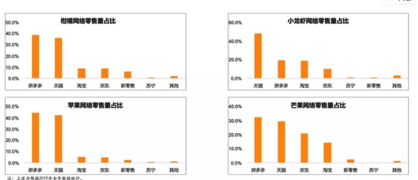 同時,在蘋果、柑橘、芒果品類的網(wǎng)絡(luò)零售量分布中,來自拼多多等新電商平臺的渠道占比分別達(dá)44.35%、38.6%、32.2%,均排名第一。在“網(wǎng)紅單品”小龍蝦品類中,傳統(tǒng)電商平臺仍占絕對優(yōu)勢,但新電商平臺消費(fèi)增長迅速,渠道占比已躍居第二。