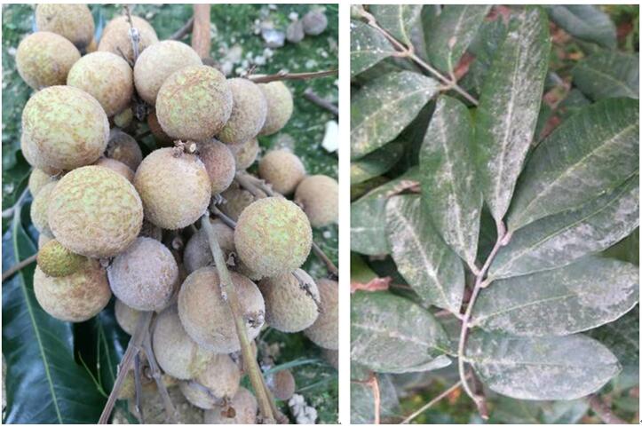 龍眼病蟲害防控專家建議,加強(qiáng)龍眼園踏查,尤其注意觀察樹冠中下層果穗,一旦發(fā)現(xiàn)白色霉?fàn)钗铮訌?qiáng)監(jiān)控,病果超過5%的龍眼果園應(yīng)及時(shí)噴藥防治。對(duì)于距采摘10天以上病株,可噴灑25%咪鮮胺(施??耍┤橛?500倍液,或45%咪鮮胺(施??耍┧閯?000—2500倍液,或250克/升吡唑醚菌酯(凱潤)乳油1000—2000倍,或60%唑酯·代森聯(lián)(百泰)水分散粒劑1000—1500倍,或25%嘧菌酯(阿米西達(dá))懸浮劑 800—1500 倍,或50%多菌靈可濕性粉劑500—1000倍液,1—2次,間隔7—10天。對(duì)于接近采收的果園,即距采摘不足10天的病株,僅限噴灑25%咪鮮胺(施??耍┤橛?500倍液或45%咪鮮胺(施??耍┧閯?000—2500倍液1次,以保證龍眼果品安全。