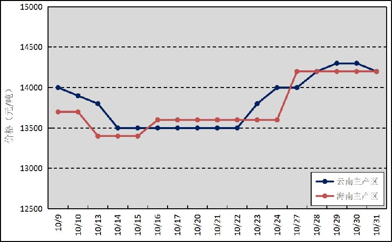 國內(nèi)主產(chǎn)區(qū):云南產(chǎn)區(qū)天氣狀況較好,割膠作業(yè)有序恢復(fù),原料供應(yīng)小幅增量。海南產(chǎn)區(qū)臺風、降水天氣擾動偏多,對割膠作業(yè)影響明顯,新膠上量節(jié)奏緩慢,產(chǎn)區(qū)旺產(chǎn)季供應(yīng)不旺特征凸顯。云南、海南鮮膠乳(折干膠)月均價格分別為13824元/噸、13753元/噸,環(huán)比分別下跌717元/噸、783元/噸。