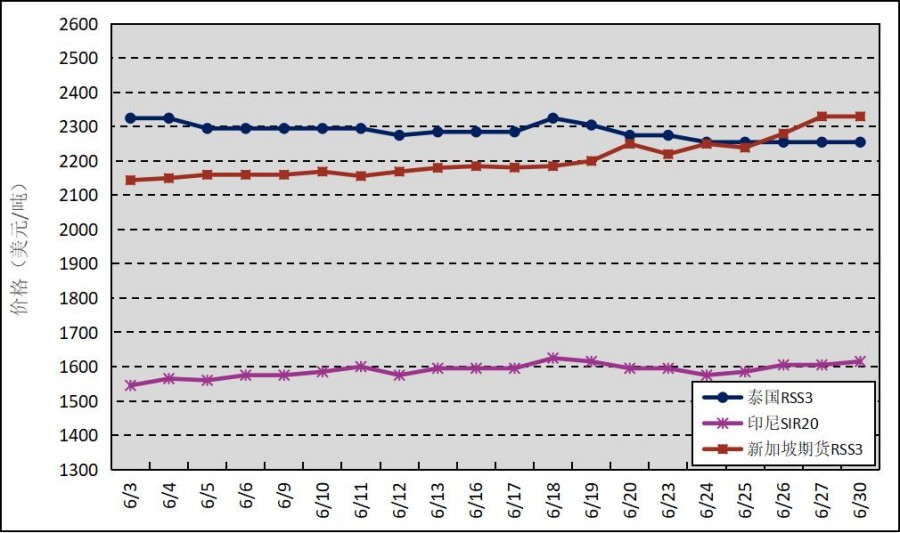 國(guó)外主產(chǎn)區(qū):6月,泰國(guó)RSS3平均價(jià)格為2286美元/噸,環(huán)比下跌16美元/噸,最高價(jià)為2325美元/噸,最低價(jià)為2255美元/噸;印尼SIR20平均價(jià)格為1589美元/噸,環(huán)比下跌93美元/噸,最高價(jià)為1625美元/噸,最低價(jià)為1545美元/噸;新加坡RSS3期貨主力合約月均結(jié)算價(jià)格為2205美元/噸,環(huán)比下跌31美元/噸,最高價(jià)為2330美元/噸,最低價(jià)為2144美元/噸。
