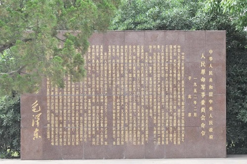 農(nóng)建四師暨淮海農(nóng)場歷史陳列館是在農(nóng)建四師大院舊址上建起來的。走進院門,迎面矗立著的是一座由大理石雕刻的碑文?!皩⒐鈽s的祖國經(jīng)濟建設(shè)任務(wù)賦予你們……當祖國需要召喚你們的時候,我將命令你們重新拿起戰(zhàn)斗武器,捍衛(wèi)祖國。”游客來到農(nóng)建四師大院參觀時,陳列館解說員首先向游客介紹毛主席的這份命令。
