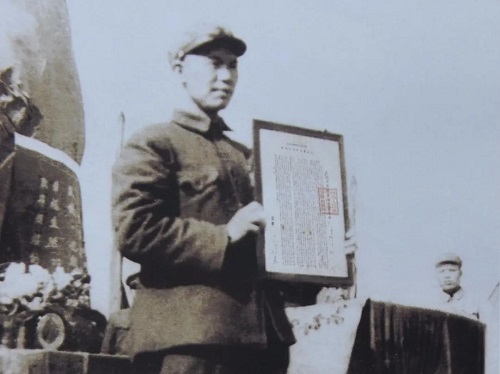 1952年4月20日上午8點,102師近萬余官兵正點到達海門縣三廠鎮(zhèn)廣場,在這里集結(jié)并舉行誓師大會。蘇北軍區(qū)副司令員常玉清,在師首長陪同下檢閱了部隊后,代表人民革命軍事委員會,向全師指戰(zhàn)員宣布毛澤東主席命令:“中國人民解放軍步兵第102師改編為農(nóng)業(yè)建設(shè)第四師”。