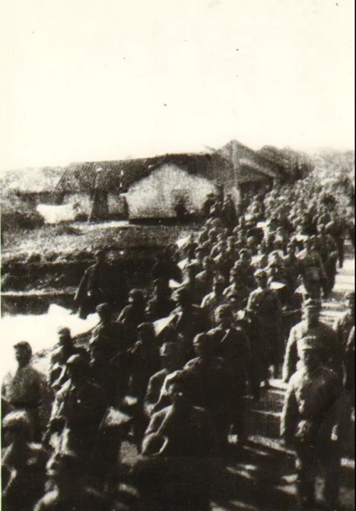 1952年4月22日凌晨,農(nóng)建四師的全體將士,全副武裝,沐浴著帶露的晨曦,揮師北上,向蘇北黃海之濱,蘇北灌溉總渠下游兩岸出發(fā)。出發(fā)時,海門縣縣長茅錫堂率黨政機關(guān)、學(xué)校、團體和從四面八方趕來的數(shù)萬群眾,敲鑼打鼓,在路邊歡送。