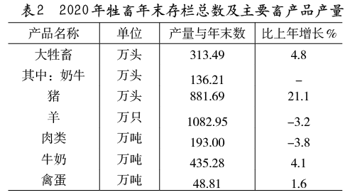表2  2020年牲畜年末存欄總數(shù)及主要畜產(chǎn)品產(chǎn)量