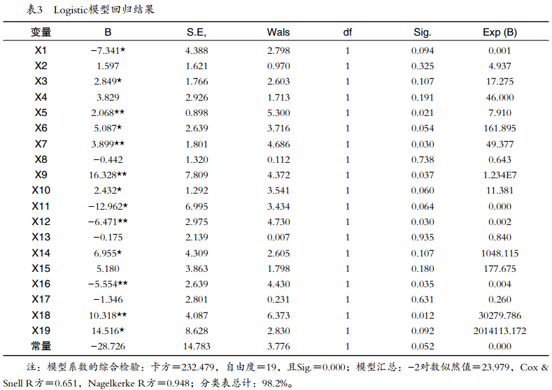 利用微觀調(diào)研數(shù)據(jù),從農(nóng)戶自身特征、家庭特征、割膠制度認(rèn)知特征、天然橡膠市場(chǎng)、基層組織環(huán)境角度的分析結(jié)果,對(duì)膠農(nóng)選擇割膠制度存在一定影響,本節(jié)從計(jì)量數(shù)學(xué)方法上分析民營(yíng)膠農(nóng)選擇割膠制度的影響因素。二元Logistic模型是線性回歸逐漸發(fā)展的產(chǎn)物,當(dāng)被解釋變量、解釋變量中存在0/1二值品質(zhì)型變量時(shí),一般線性回歸模型不能夠滿足回歸分析,繼而選擇二元Logistic回歸模型。本文以我國(guó)民營(yíng)膠農(nóng)割膠制度選擇情況為因變量,影響膠農(nóng)割膠制度選擇的變量為自變量,二元Logistic模型適合本文研究。