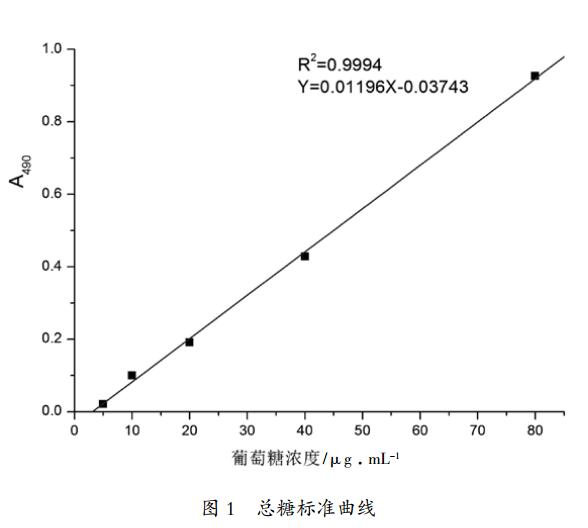 參照文獻(xiàn)[5]方法并稍作修改:分別配置濃度為 5、10、20、40、80μg/mL 的葡萄糖標(biāo)準(zhǔn)溶液。吸取 2 mL 各濃度溶液分別置于 10 mL 具塞試管中,向各管試液中加入 1.0 mL 5%苯酚溶液,然后快速加入 5.0 mL 濃硫酸,混合均勻后室溫放置 30 min。取適量反應(yīng)液用紫外-可見分光光度計(jì)于 490 nm 處測(cè)定吸光值。以葡萄糖質(zhì)量濃度為橫坐標(biāo),吸光值為縱坐標(biāo),繪制標(biāo)準(zhǔn)曲線。稱取約 0.25 g 試樣,水解后按以上步驟操作,以空白溶液調(diào)零,測(cè)得待測(cè)液的吸光值,以標(biāo)準(zhǔn)曲線計(jì)算總糖含量(圖 1)。