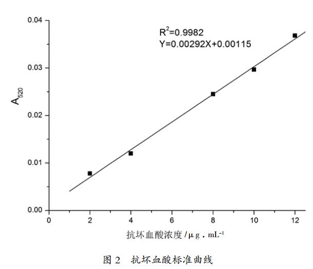 參照文獻(xiàn)[6]方法測(cè)定面包果中抗壞血酸含量:①標(biāo)準(zhǔn)曲線。配制濃度為 1 mg/mL 的抗壞血酸標(biāo)準(zhǔn)溶液,取該標(biāo)準(zhǔn)溶液50 mL 于錐形瓶中,加入 2 g 活性炭,振搖 2 min 后過(guò)濾,棄除初濾液,收集濾液備用。以上述濾液分別配制濃度為 2、4、8、10、12μg/mL 的抗壞血酸標(biāo)準(zhǔn)溶液。吸取 4 mL 各濃度溶液分別置于 10 mL 具塞 試 管 中 , 除 空 白 管 外 , 往 其 他 各 試 管 中 分 別 加入 1.0 mL 2,4-二硝基苯肼,搖勻后將所有試管置于 37 ℃±0.5 ℃ 水浴鍋中保溫 3 h,除空白管外,其他各試管置于冰水中??瞻坠芾鋮s至室溫后,往試液中加入 1 mL 2,4-二硝基苯肼溶液,室溫放置 15 min 左右后置于冰水中,然后往所有試管中分別加入5 mL 濃硫酸,滴加時(shí)間控制在 1 min,邊加邊振搖試管。硫酸加入完畢后,將試管由冰水中取出,室溫下準(zhǔn)確放置 30 min,用紫外-可見分光光度計(jì)在 520 nm 處測(cè)定各組試液的吸光值。以抗壞血酸質(zhì)量濃度為橫坐標(biāo),吸光值為縱坐標(biāo),繪制標(biāo)準(zhǔn)曲線。②樣品制備及測(cè)定。鮮樣制備,稱 10 g 鮮樣和 10 g 草酸(20 g/L)于研缽中,搗成勻漿,轉(zhuǎn)移到 100 mL 容量瓶中,用草酸(10 g/L)稀釋至刻度,搖勻。過(guò)濾,取濾液備用;干樣制備,稱取 1~4 g 樣品于研缽中,用草酸(10 g/L)磨成勻漿,轉(zhuǎn)入 100 mL 容量瓶中,定容,搖勻。過(guò)濾,取濾液備用;氧化處理,取 25 mL 上述濾液于錐形瓶中,加入 2 g 活性炭,振搖 2 min 后過(guò)濾,棄去初濾液,取 10 mL 此氧化提取液,加入 10 mL 硫脲溶液(20 g/L)混合均勻,備用。測(cè)定上述氧化稀釋液的吸光值,以標(biāo)準(zhǔn)曲線計(jì)算抗壞血酸含量(圖 2)。