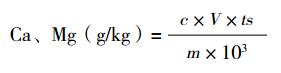 式中:c 從標(biāo)準(zhǔn)曲線查得的顯色液 Ca、Mg 的質(zhì)量濃度(mg/mL);V 顯色液體積(mL);ts 分取倍數(shù);m 干樣品質(zhì)量(g);103 克換算成毫克。