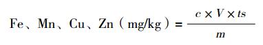 1.2.8.3 樣品測(cè)定。Ca、Mg 測(cè)定,吸取母液1 mL 至 50 mL 容量瓶中,加入 5%氯化鍶溶液 2 mL,用去離子水定容,用原子吸收分光光度計(jì)測(cè)定;Fe、Mn、Cu、Zn 含量測(cè)定,F(xiàn)e、Mn、Cu、Zn 原液上機(jī),用原子吸收分光光度計(jì)測(cè)定。