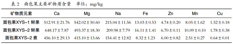 由表 2 可知,面包果中含有豐富的礦物質(zhì)和微量元素,尤其是 Ca、Mg 含量較高,要明顯高于其他礦物質(zhì)的含量。此外,面包果還含有 Fe、Zn、Mn、Cu 等人體必需微量元素。對(duì)比面包果的 2 個(gè)品系XYS-1 和 XYS-2,礦物質(zhì)含量存在一定的差異,但是差別不大。面包果XYS-1鮮果和面包果 XYS-2 鮮果中 Ca、Mg、Na、Fe、Zn、Mn、Cu 礦物質(zhì)含量分別為 512.91±21.76、542.02±50.60、215.04±11.56、13.03±0.53、4.74±0.20、8.05±1.62、1.52±0.18 mg/kg 和 648.17±7.87、493.37±18.30、209.98±7.79、16.11±1.41、6.70±0.11、10.09±0.10、1.78±0.38 mg/kg;平均含量分別為 580.54、517.69、212.51、14.57、5.72、9.07、1.65 mg/kg。面包果 XYS-2 鮮果經(jīng)過(guò)煮的烹飪方式處理后,礦物質(zhì)總體呈現(xiàn)下降趨勢(shì)(表 2),與 Khempaka S[7]報(bào)道的食品加工后礦物質(zhì)元素含量會(huì)減少相一致。烹飪處理后 XYS-2 鮮果中礦物質(zhì)總體下降可能跟煮制過(guò)程中果肉結(jié)構(gòu)受熱破壞,果肉細(xì)胞內(nèi)細(xì)胞液流出有關(guān)。